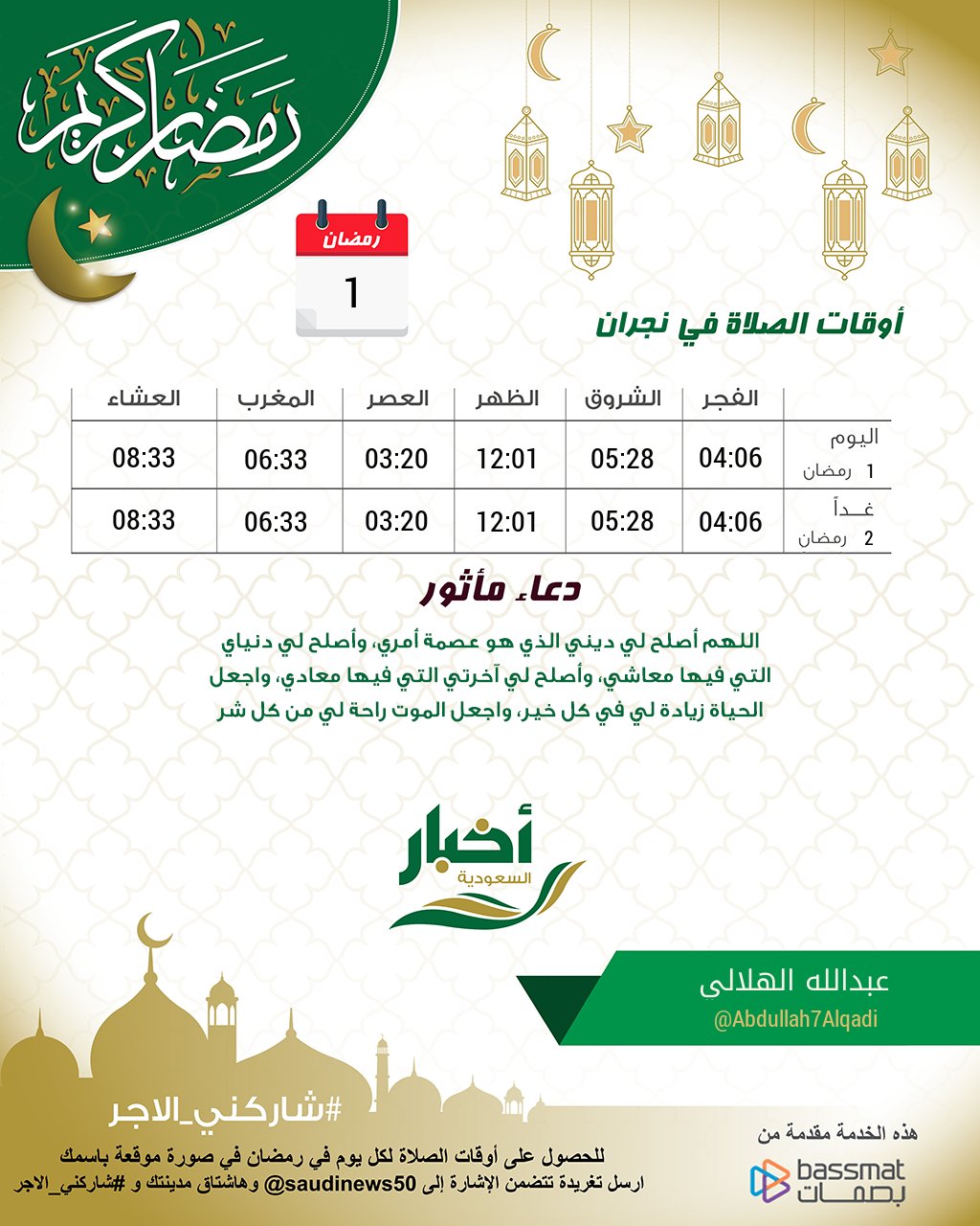 مواقيت الصلاة اليوم السعودية. مواقيت الصلاة في نجران لسنة 2020 ميلادي. تابع أوقات الصلاة في كل مدن العالم وكل الدول بدقة نراعي. مواقيت الصلاة لمدينة نجران الفجر.