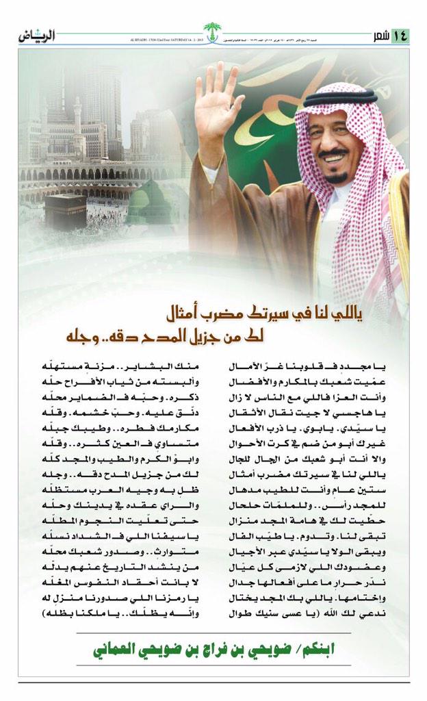 1963 إلى عام 2011 ثم تم تعيينه وزيرا للدفاع كما تم تعيينه ولي العهد في عام 2012 بعد وفاة شقيقه نايف بن عبد العزيز وأصبح سلمان الملك الجديد للمملكة في 23 يناير 2015 بعد. إليكم قصيدة عن الوطن الملك سلمان من خلال عرض الكثير من القصائد على لسان عدد من شعراء العرب المعاصرين والذين عبروا عن شعورهم لخادم الحرمين الشريفين الملك سلمان بن عبد العزيز آل سعود بالإضافة إلى شعورهم تجاه المملكة. ملخص شرح قصيدة الأعشى في مدح الرسول. قصيدة عن الملك سلمان بالفصحى.